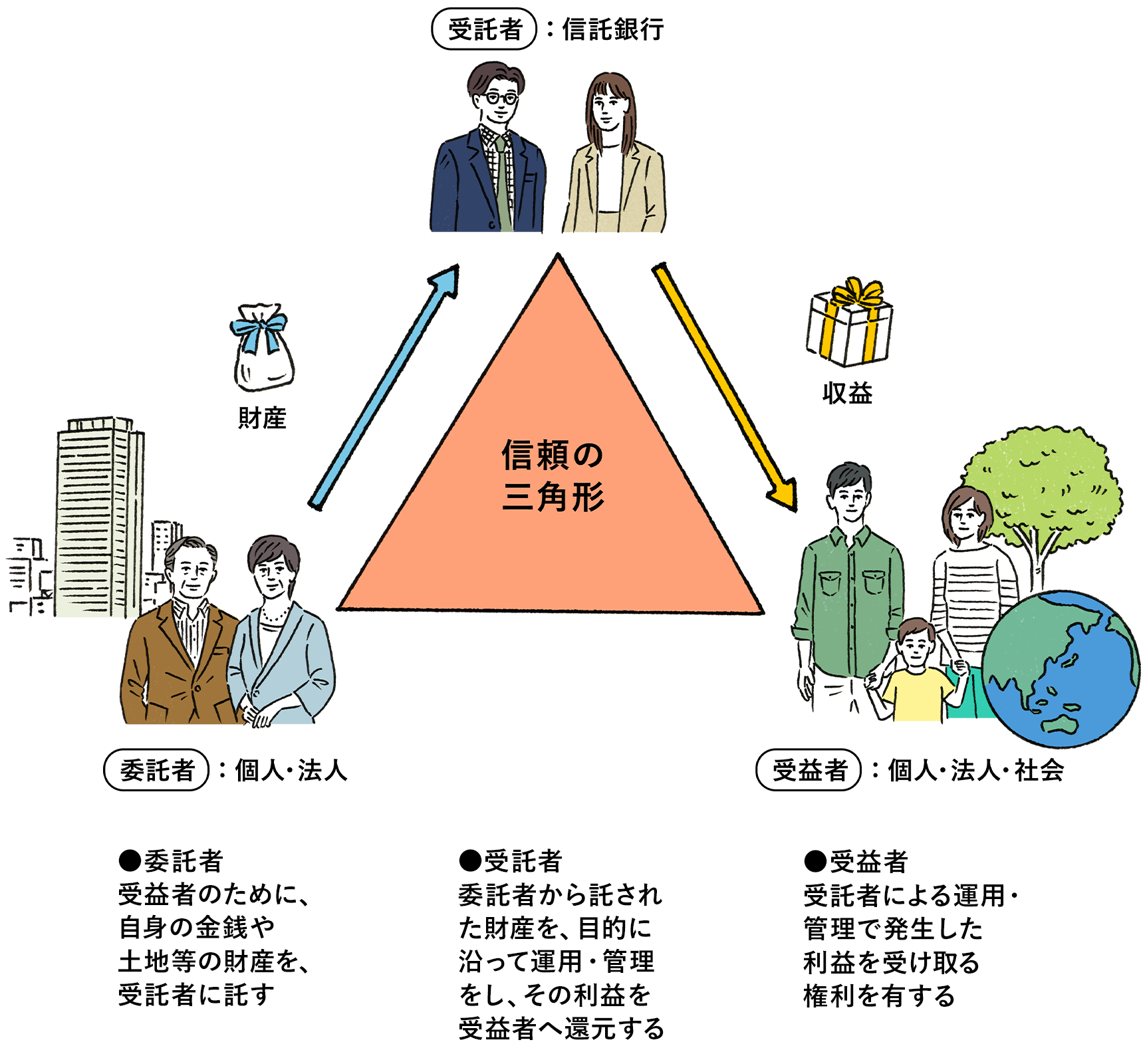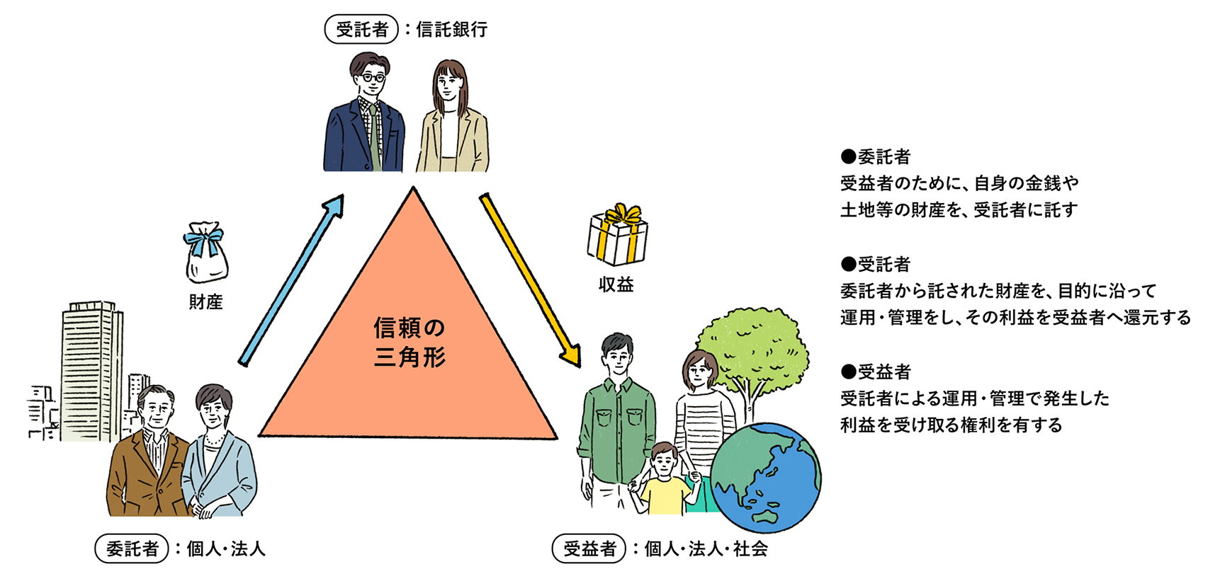 「信託」とは、個人や法人(委託者)が所有する金銭や土地などの財産を、自分自身や大切な人、社会(受益者)のために、信頼する人または専門家(受託者)に託し、法的な枠組みの下で運用・管理を任せることができる機能です。信託の機能を利用すれば、委託者は、受託者の持つ専門性を活かした資産運用や財産の保全を実現できます。