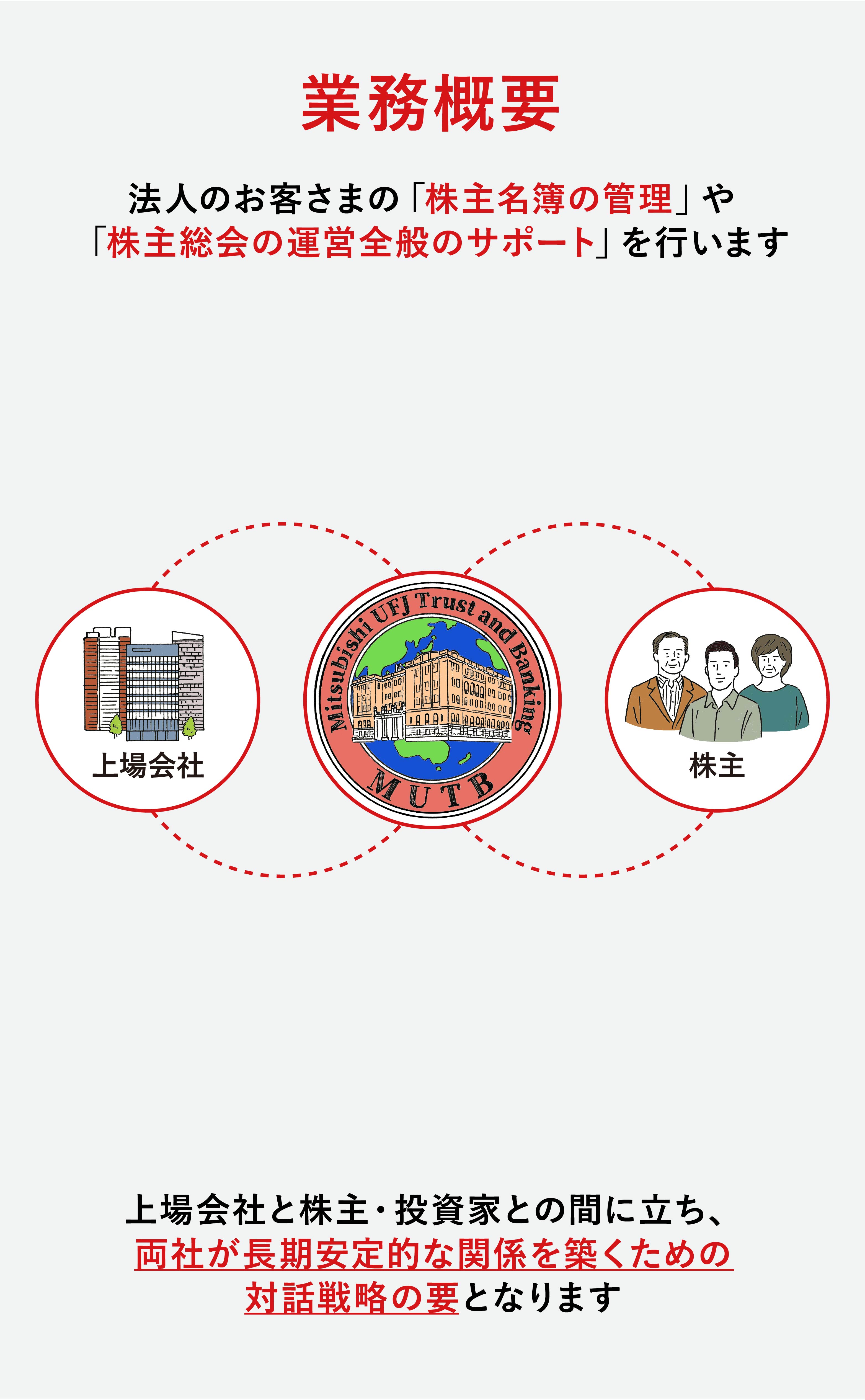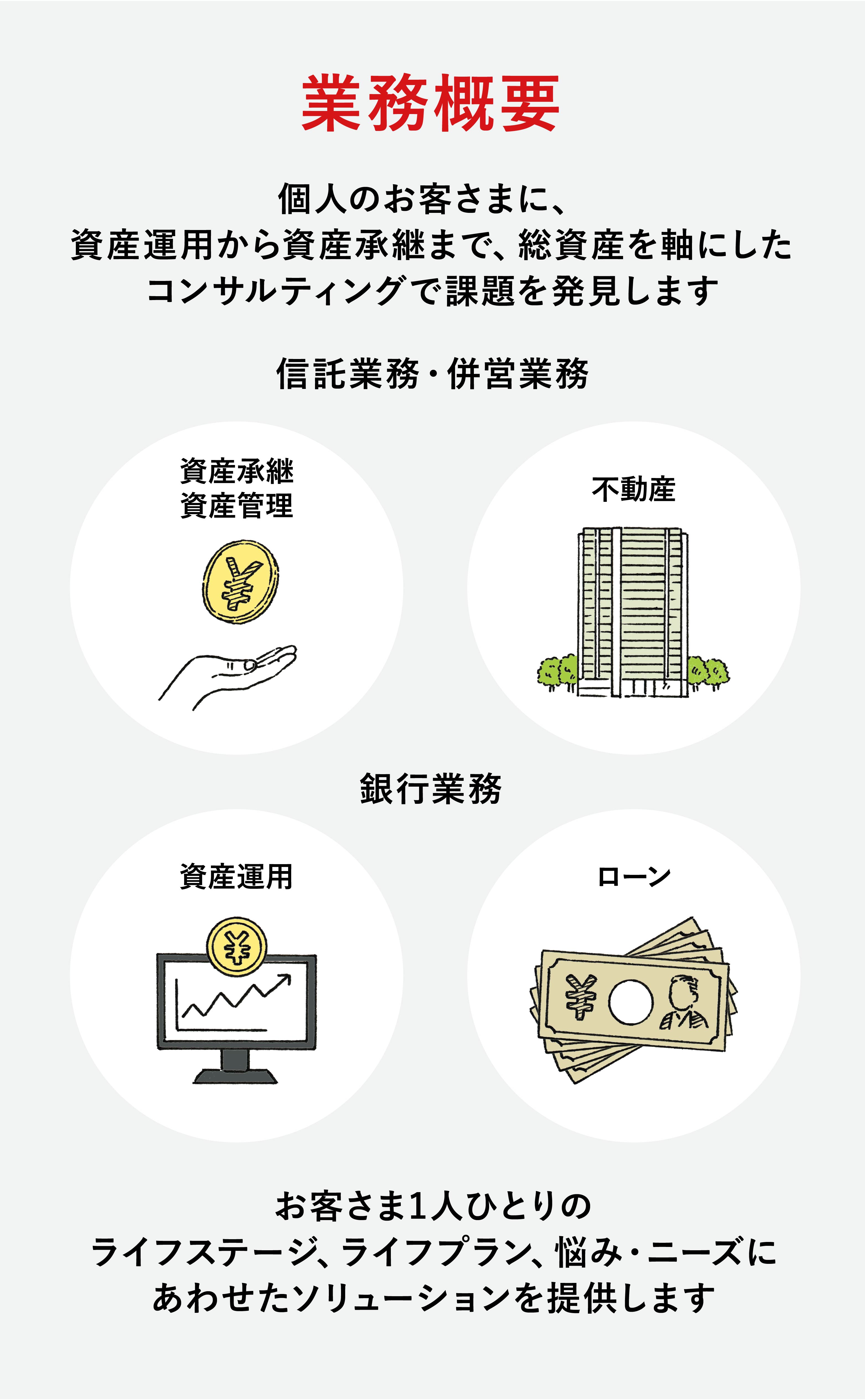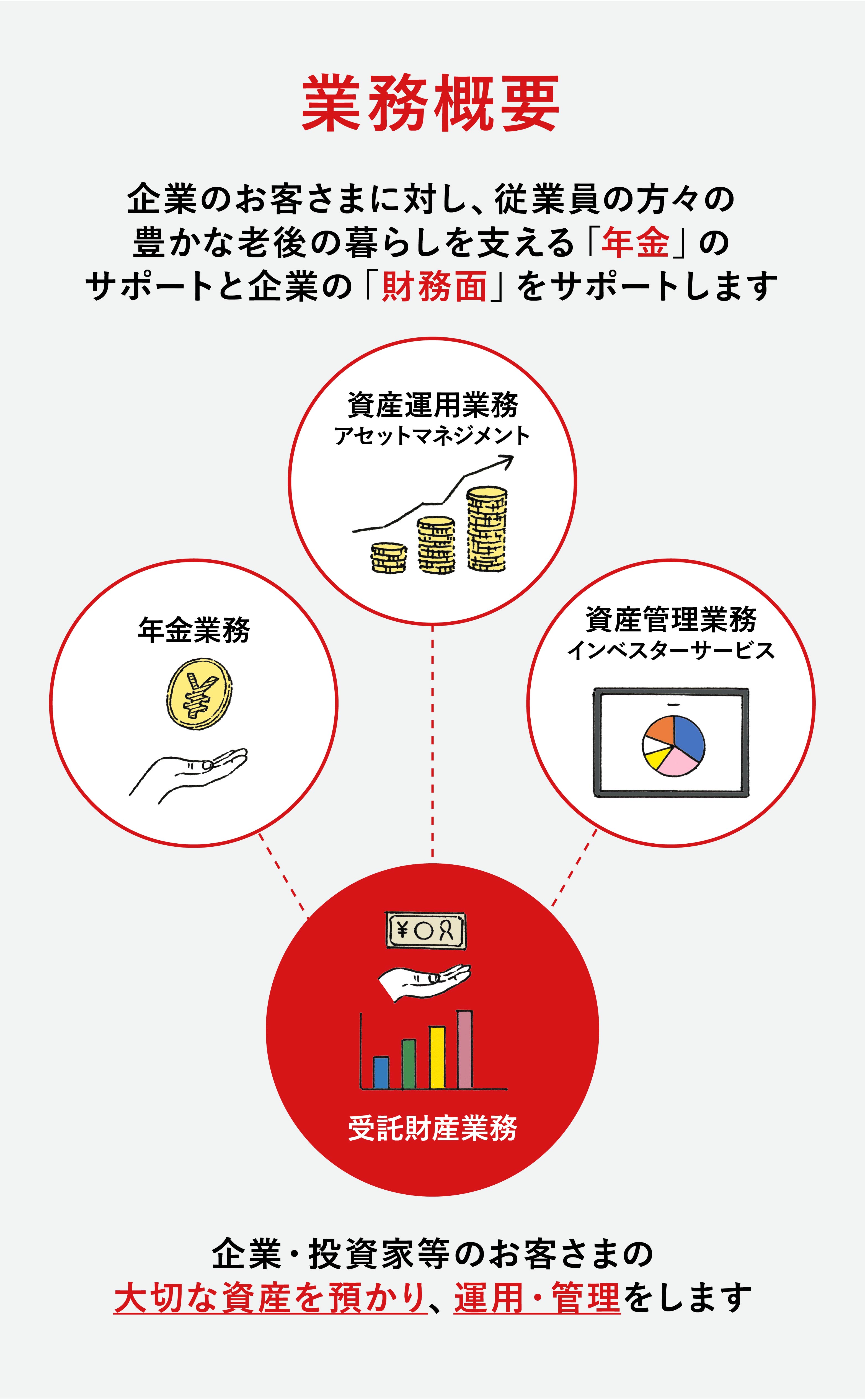 法人のお客さまに対しては、信託機能を活用し資金調達の多様化を実現する「法人事業」や、企業の戦略的不動産活用を提案する「不動産事業」、株主名簿の情報を起点に株式に関する総合的なソリューションを提供する「証券代行事業」、企業の年金制度を支える「年金事業」、年金制度等を通じてお預かりした資産を運用・管理する「資産運用事業(Asset