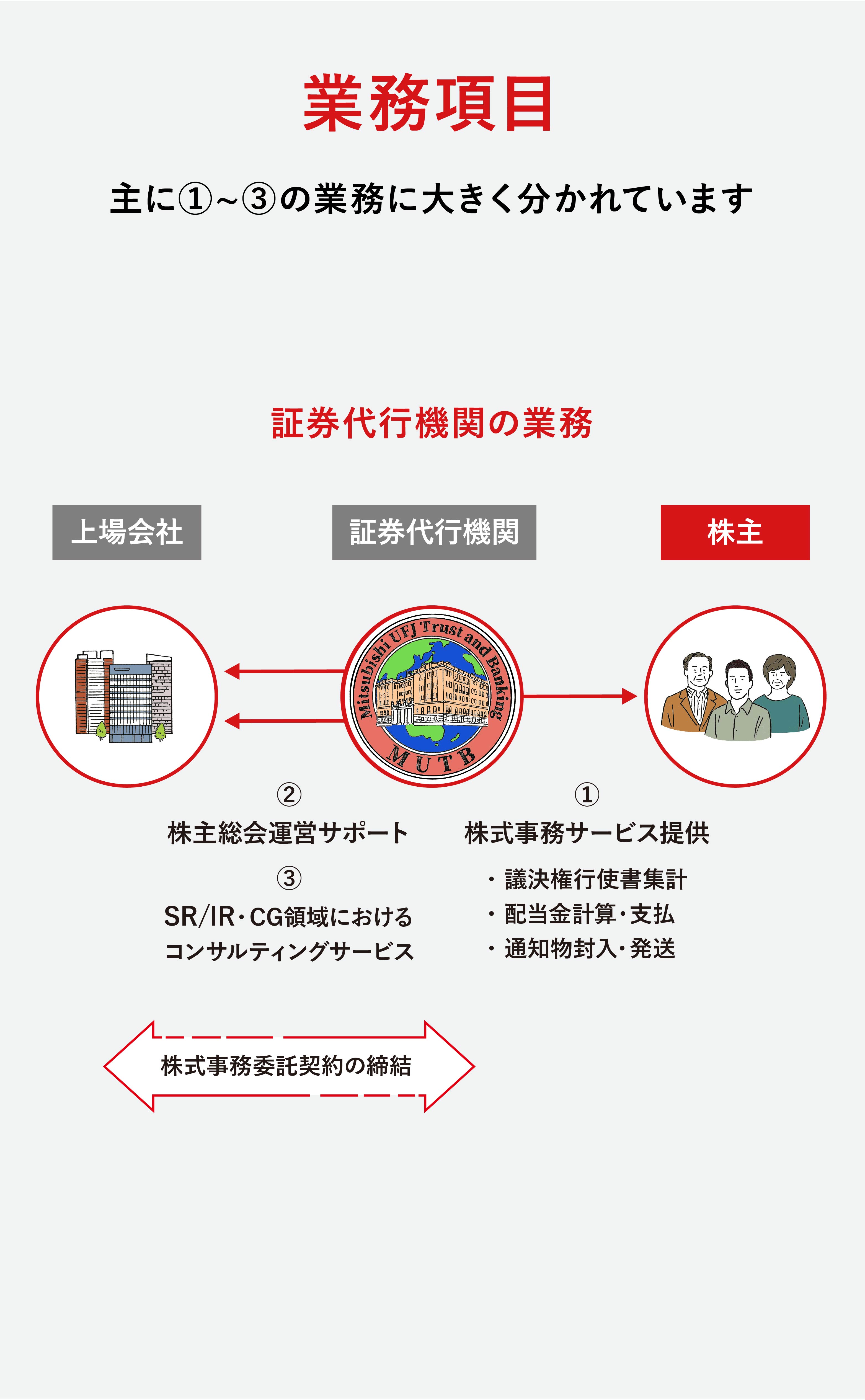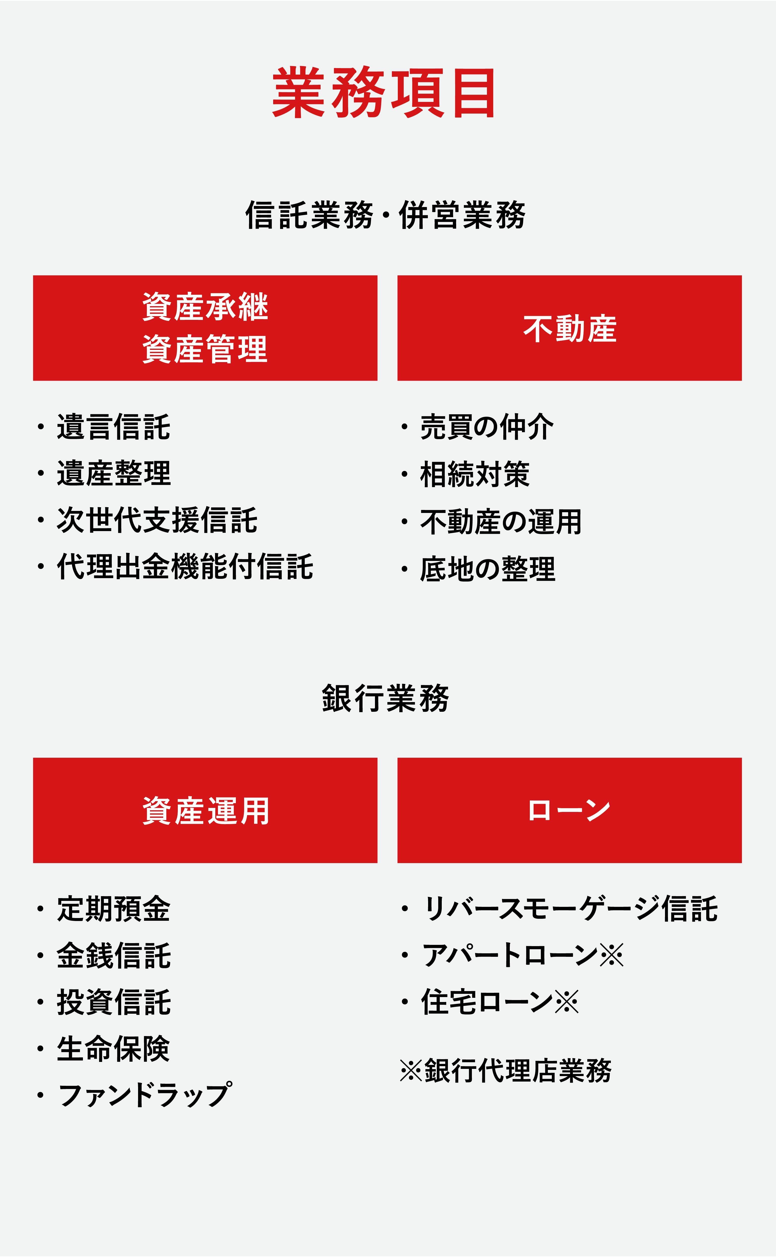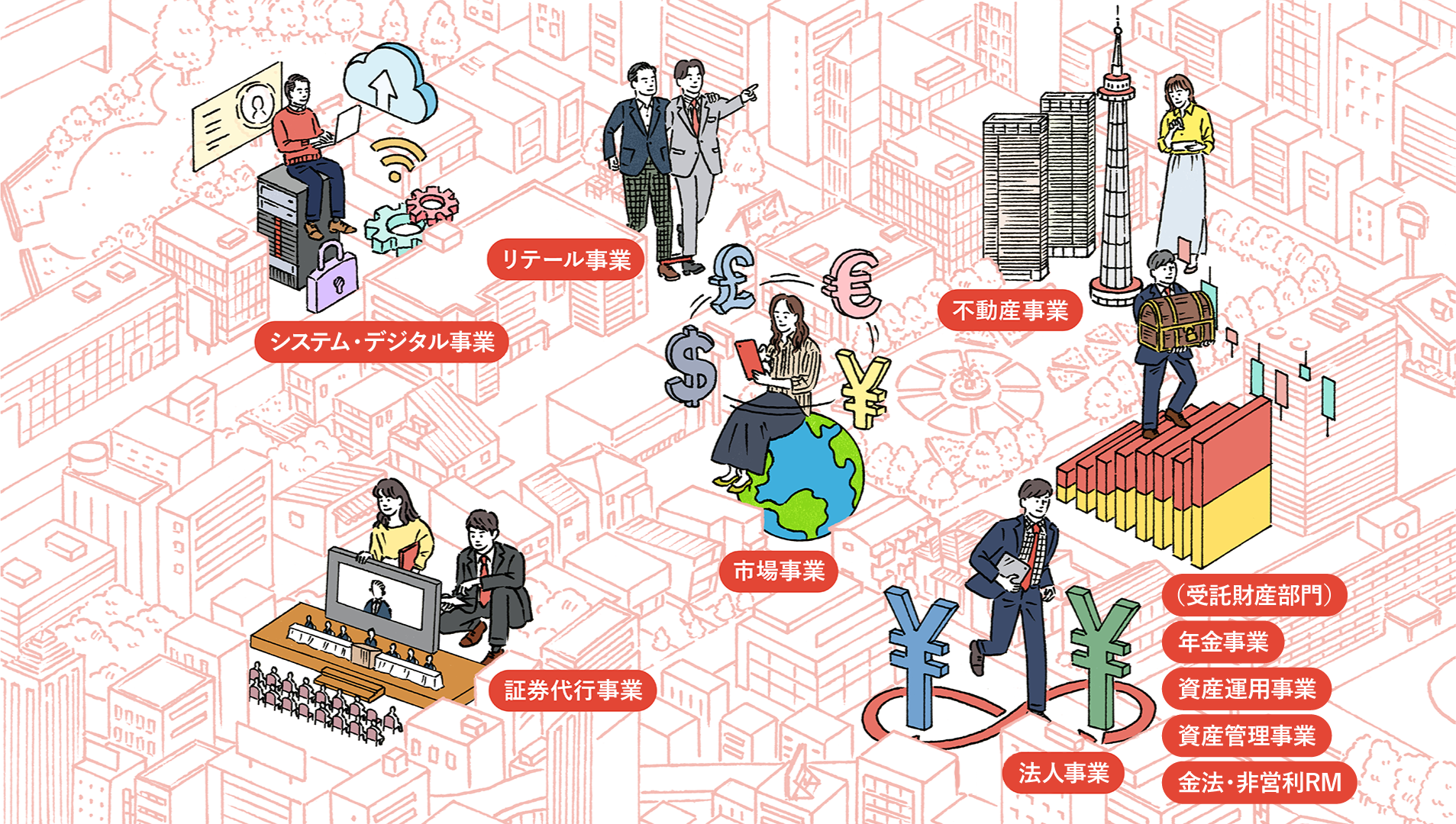 法人のお客さまに対しては、信託機能を活用し資金調達の多様化を実現する「法人事業」や、企業の戦略的不動産活用を提案する「不動産事業」、株主名簿の情報を起点に株式に関する総合的なソリューションを提供する「証券代行事業」、企業の年金制度を支える「年金事業」、年金制度等を通じてお預かりした資産を運用・管理する「資産運用事業(Asset