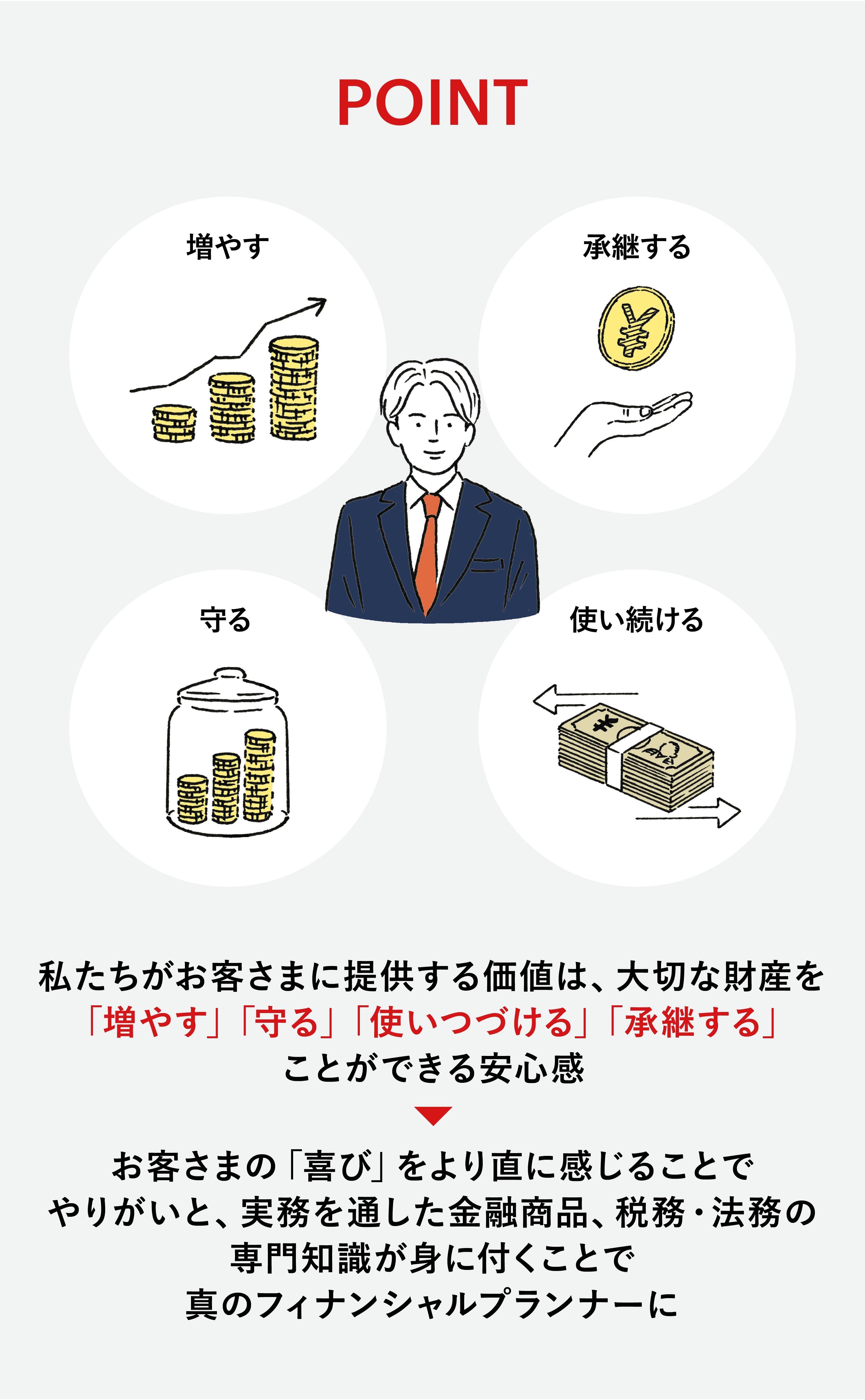 個人のお客さまの、資産状況やニーズ・想いを把握した上で、資産の運用から承継まで総資産を軸にしたコンサルティングで課題を発見。お客さまにベストなサービス・商品といったソリューションをワンストップで提供します。三菱UFJ信託銀行では、預金・投資信託・ファンドラップ・保険といった金融商品から、相続・遺言・不動産や、目的に応じた信託商品など、一般の金融機関では取り扱うことができない信託銀行ならではの幅広いソリューションも提供することができます。お客さまの「喜び」をじかに感じることでやりがいを得られ、また実務を通した金融商品、税務・法務の専門知識が身につくことで真のファイナンシャルプランナーとしてキャリアをデザインすることができます。