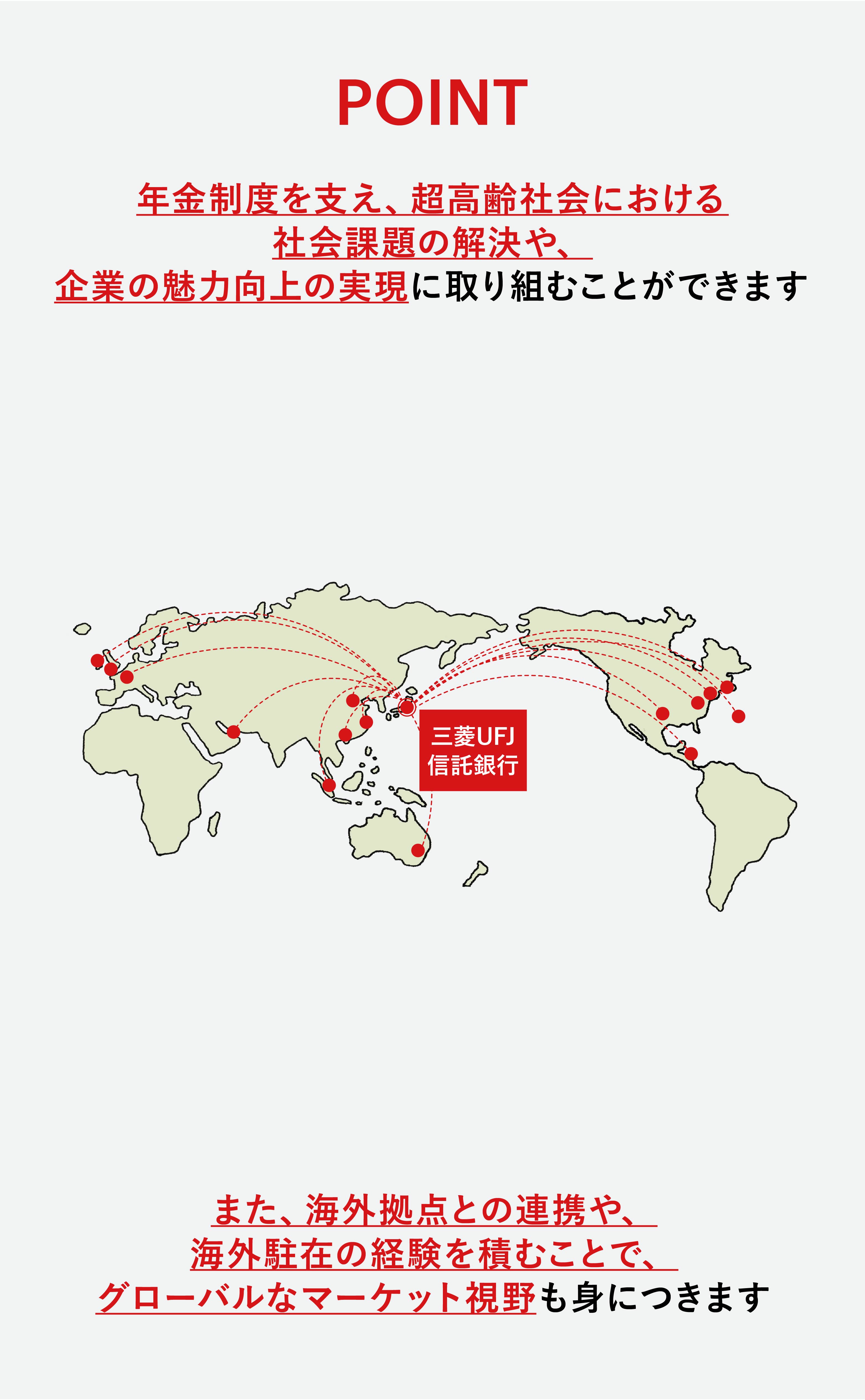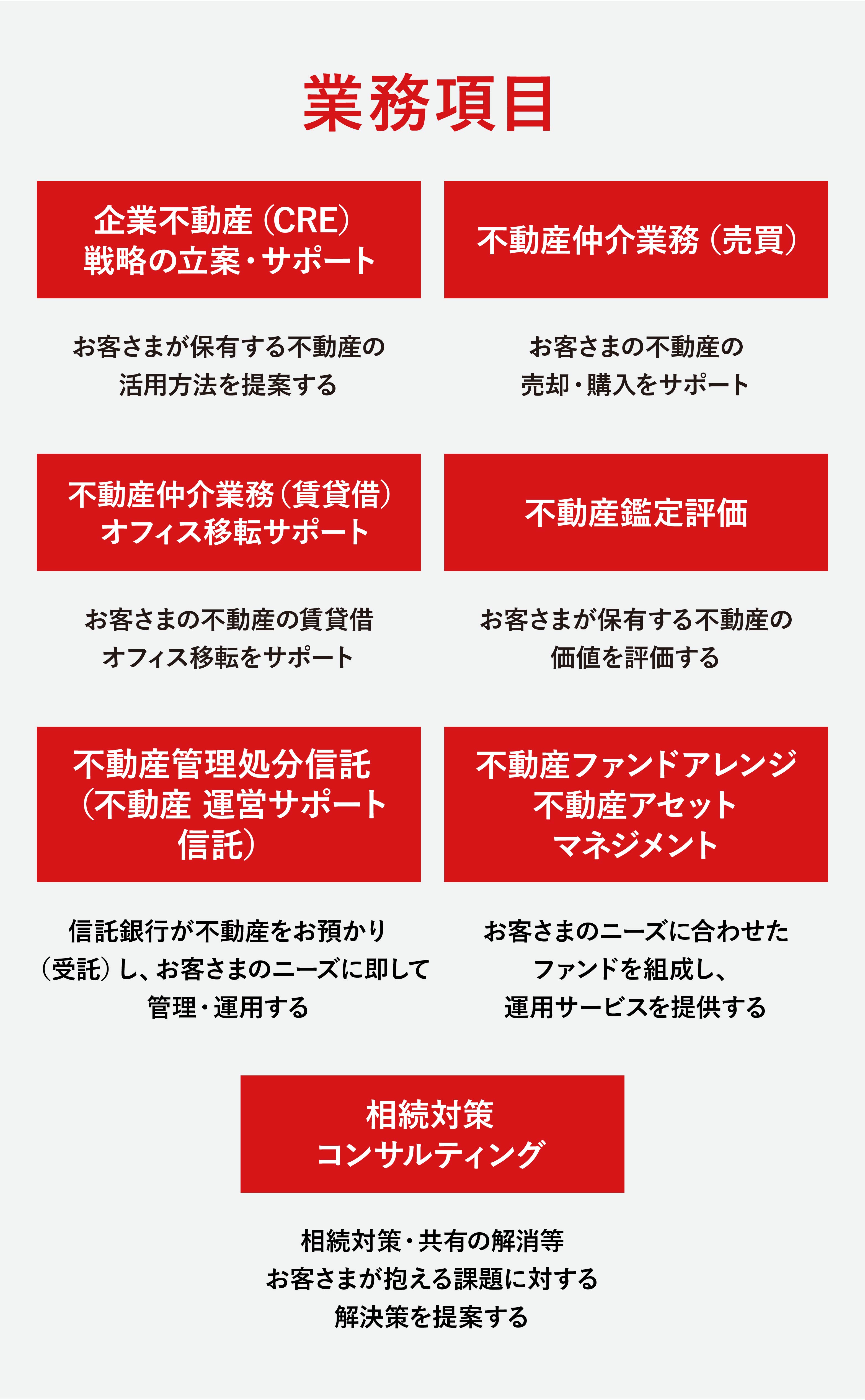 また、海外の投資家に向けても、投資対象となる不動産物件の提案や取引の仲介に加え、投資商品の組成など信託機能に付随した不動産アセットマネジメント業務もグローバルに展開しています。