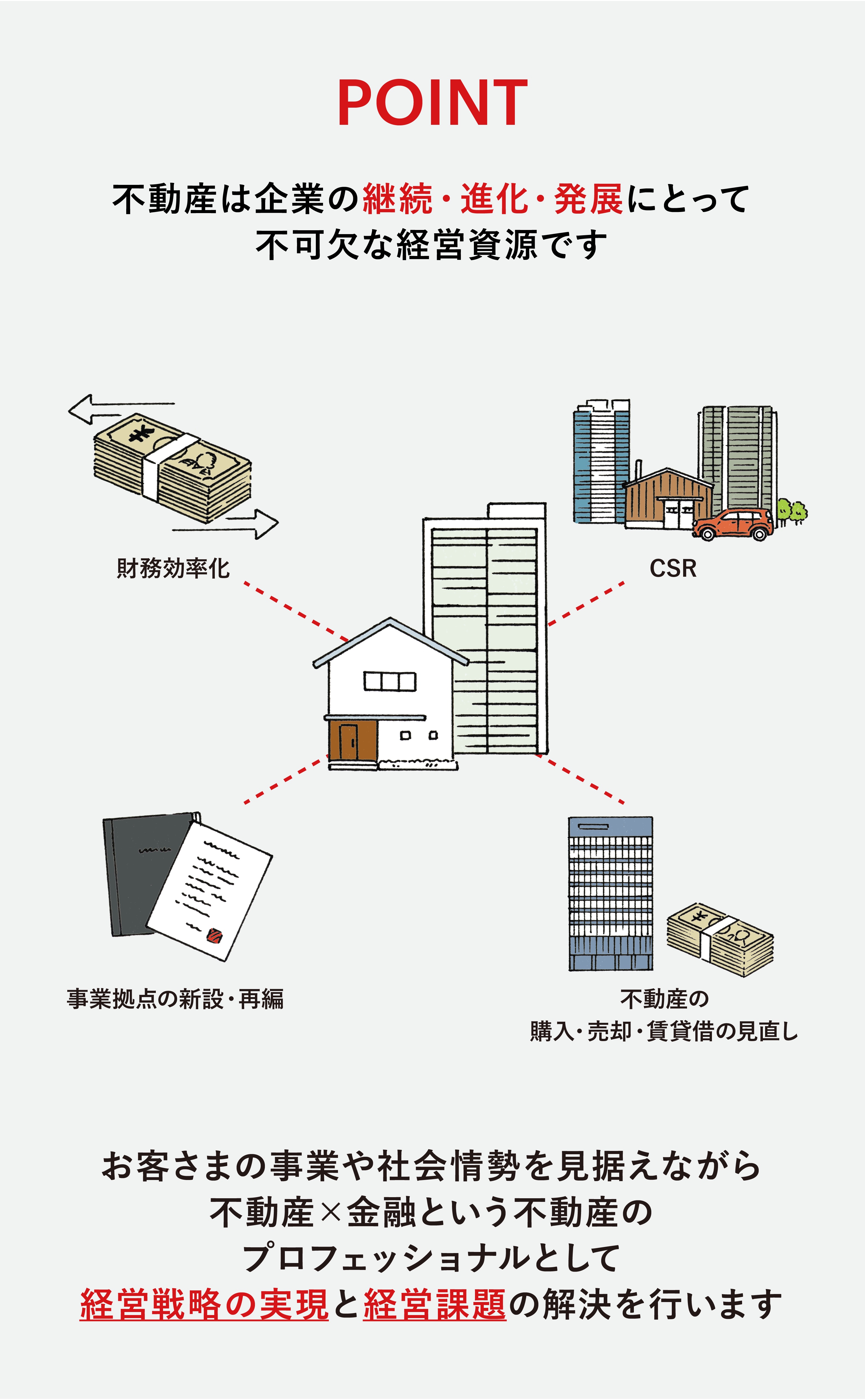 個人、法人のお客さまのニーズや経営課題を踏まえ、不動産売買仲介から不動産ファイナンス、不動産証券化、不動産管理信託など、不動産会社や一般の金融機関では取り扱うことができない信託銀行ならではのソリューションを提供します。法人のお客さまにとっての不動産は、単なる土地・建物ではなく、貴重な経営資源です。三菱UFJ信託銀行は、金融機関ならではの財務的知見と税務・法務の知識も交え、保有不動産を活用した「企業価値向上」のための“戦略立案”を行い、その“実行”までを完結できます。