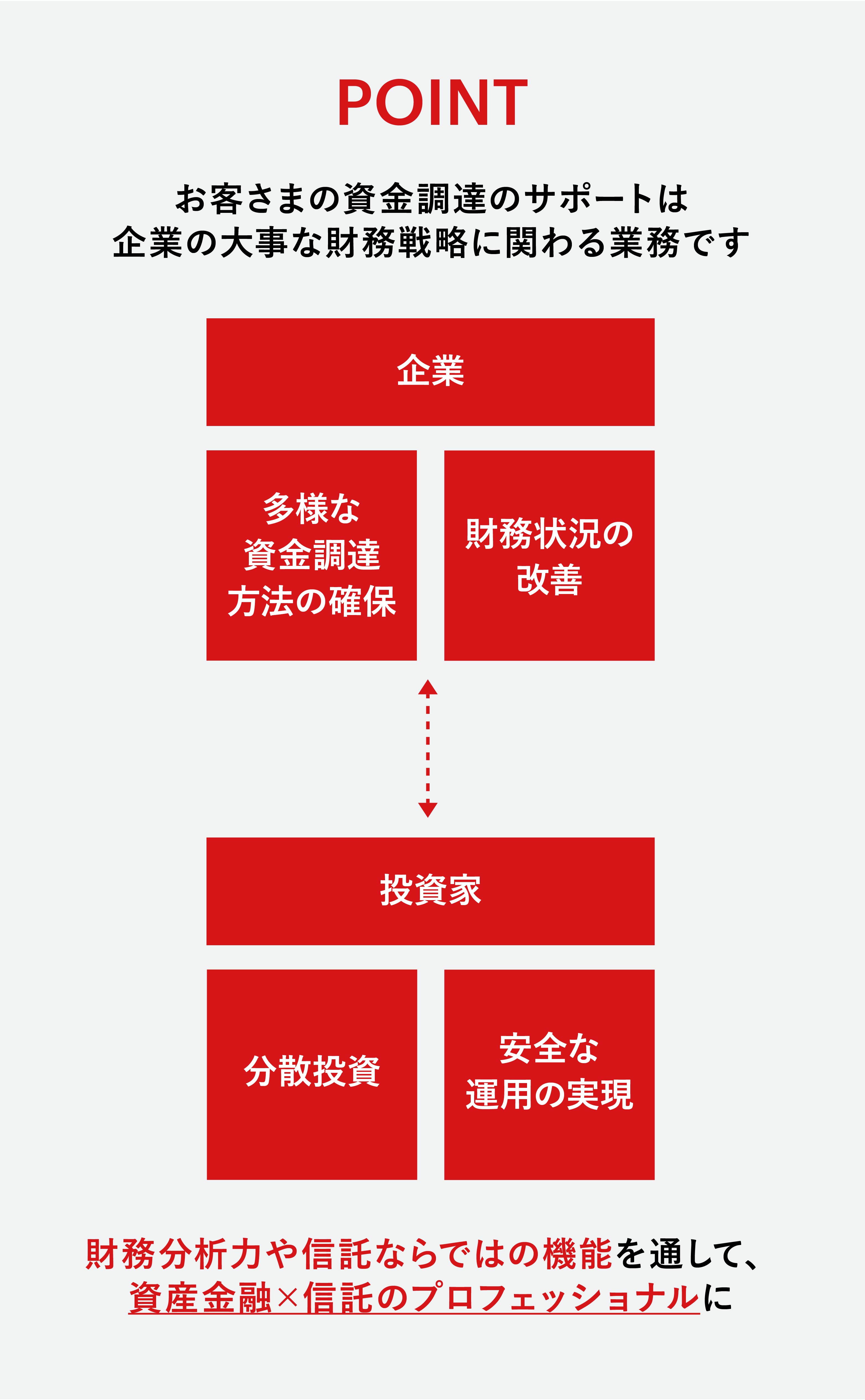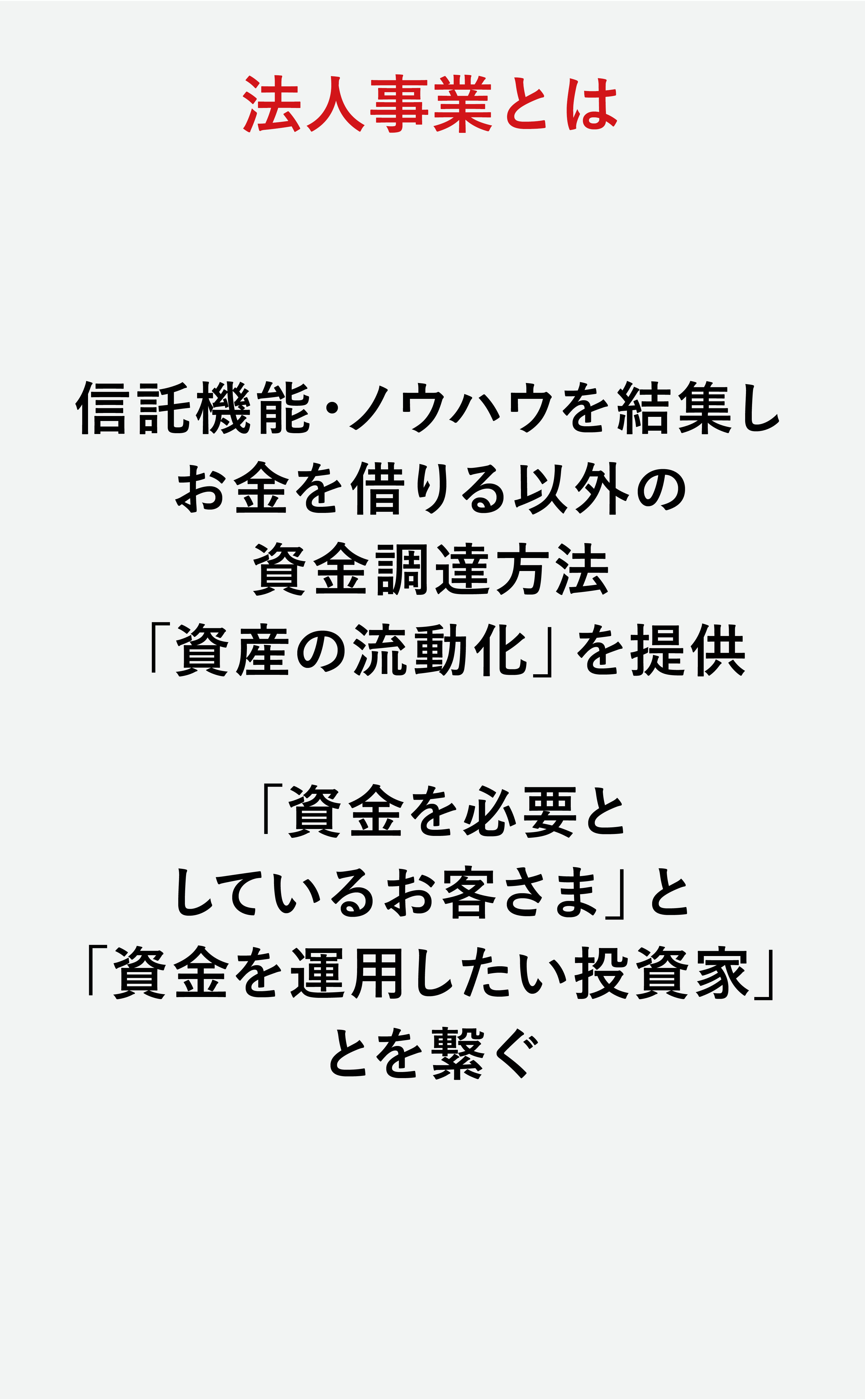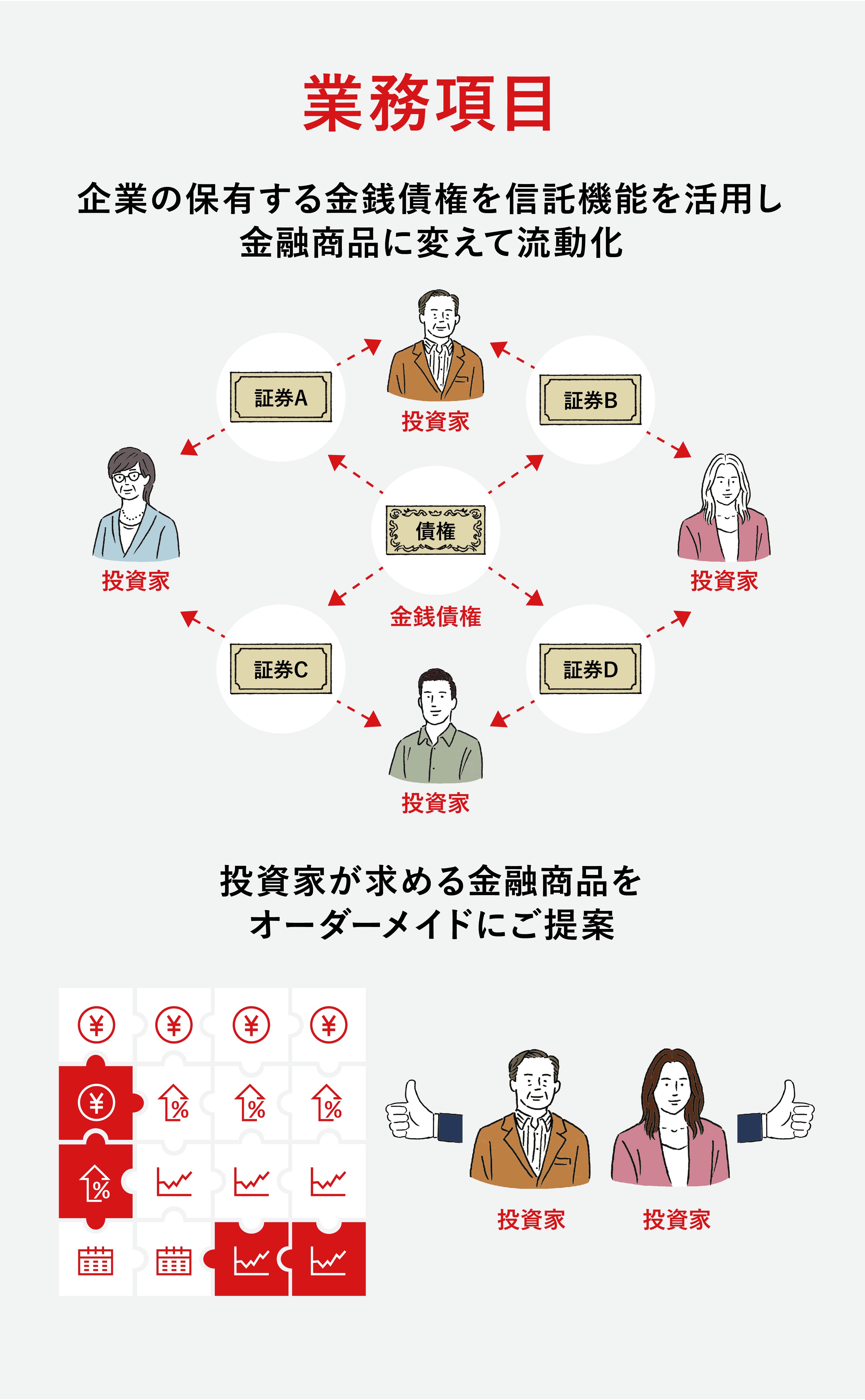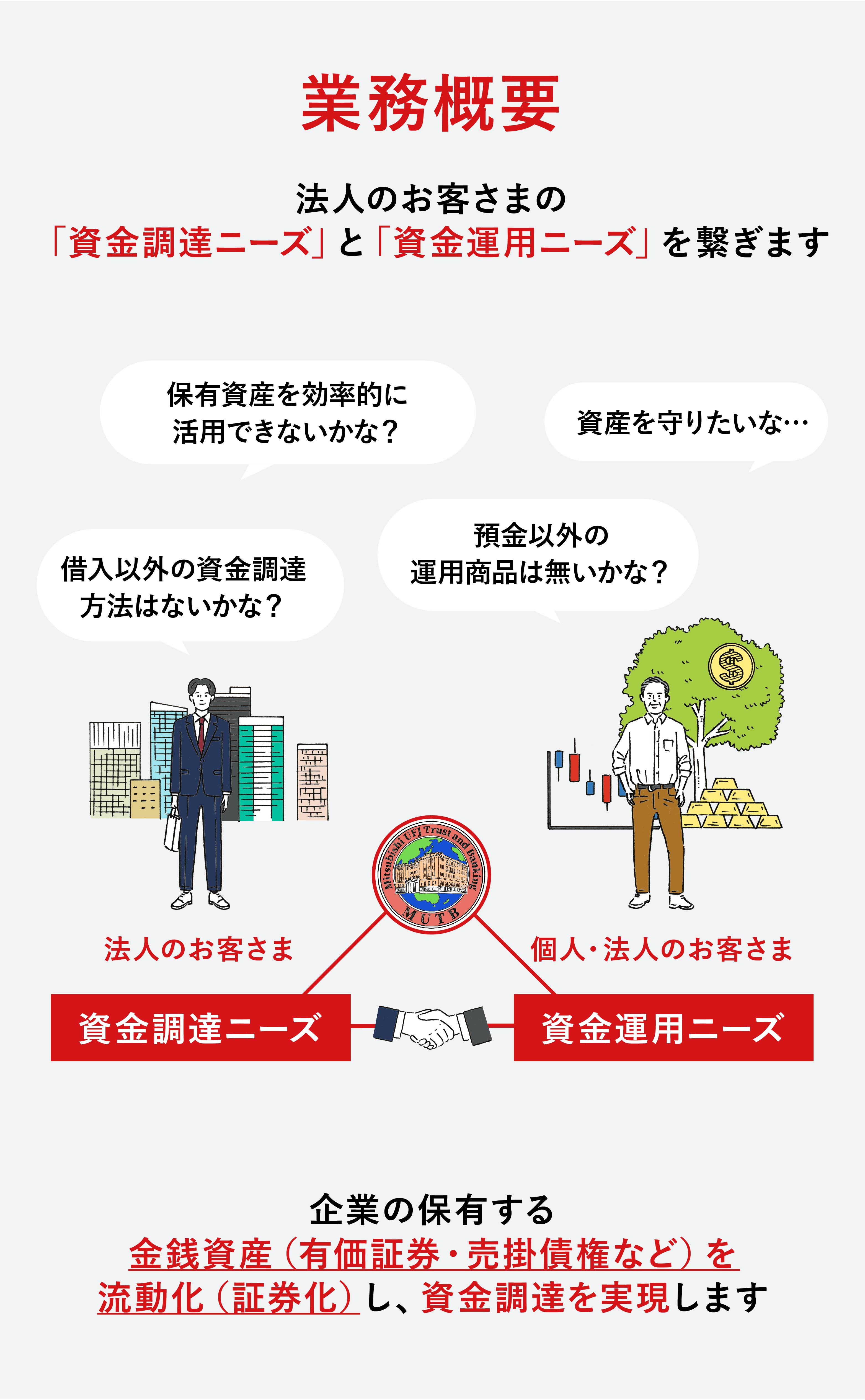信託の機能・ノウハウを結集し、お金を借りる以外の資金調達方法「資産の流動化」を提供、「資金を必要としているお客さま」と「資金を運用したい投資家」とをつなぐ