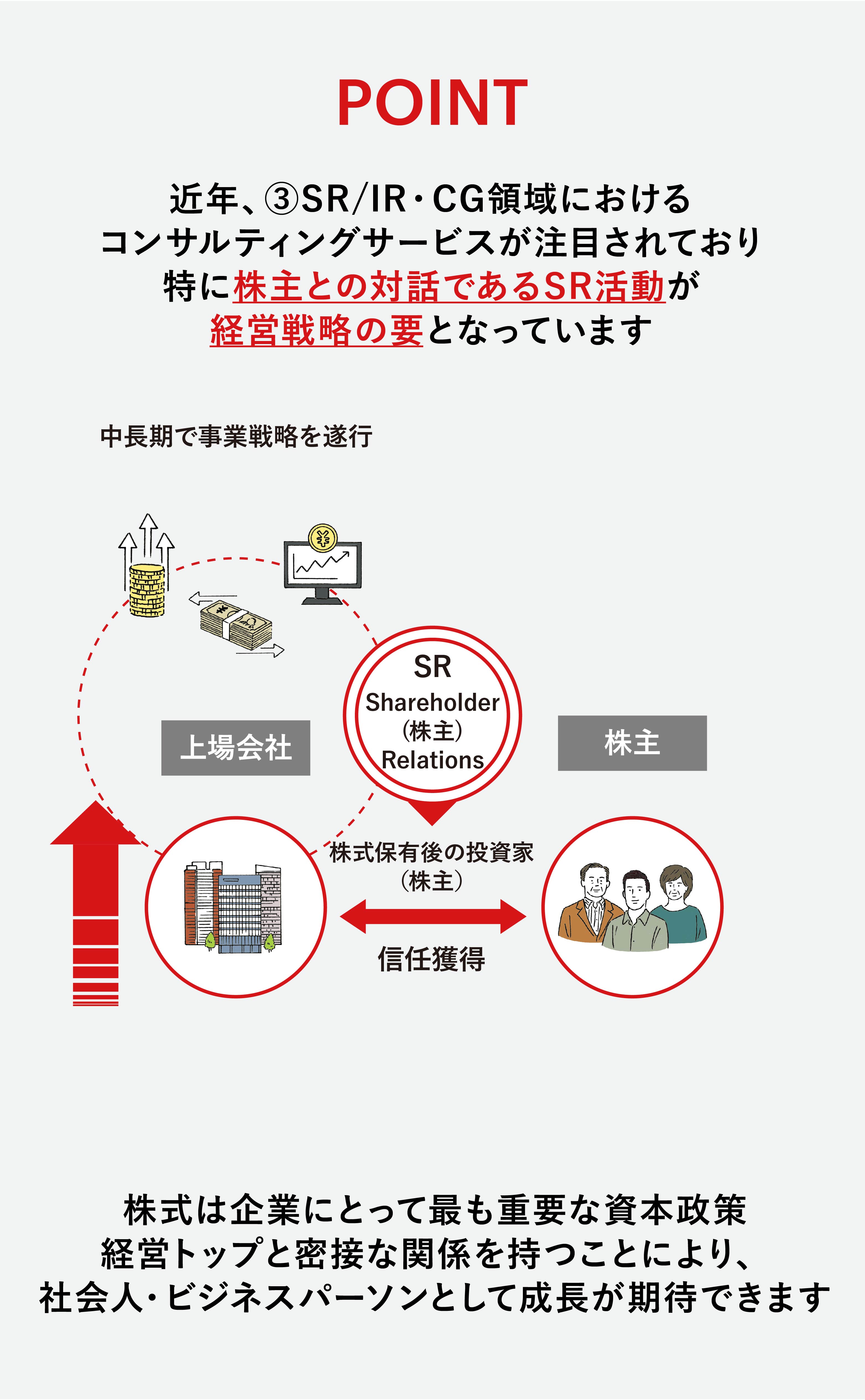 株式は企業にとって最も重要な資本政策に関わるため、経営トップと密接な関係を持つことになります。スタートアップ・ベンチャー企業から大企業まで、証券代行の実務を通じ、会社法をはじめ、財務や税務・法務など幅広い知識を習得できるだけでなく、経営トップと対峙するなかで社会人・ビジネスパーソンとしての成長も期待できます。