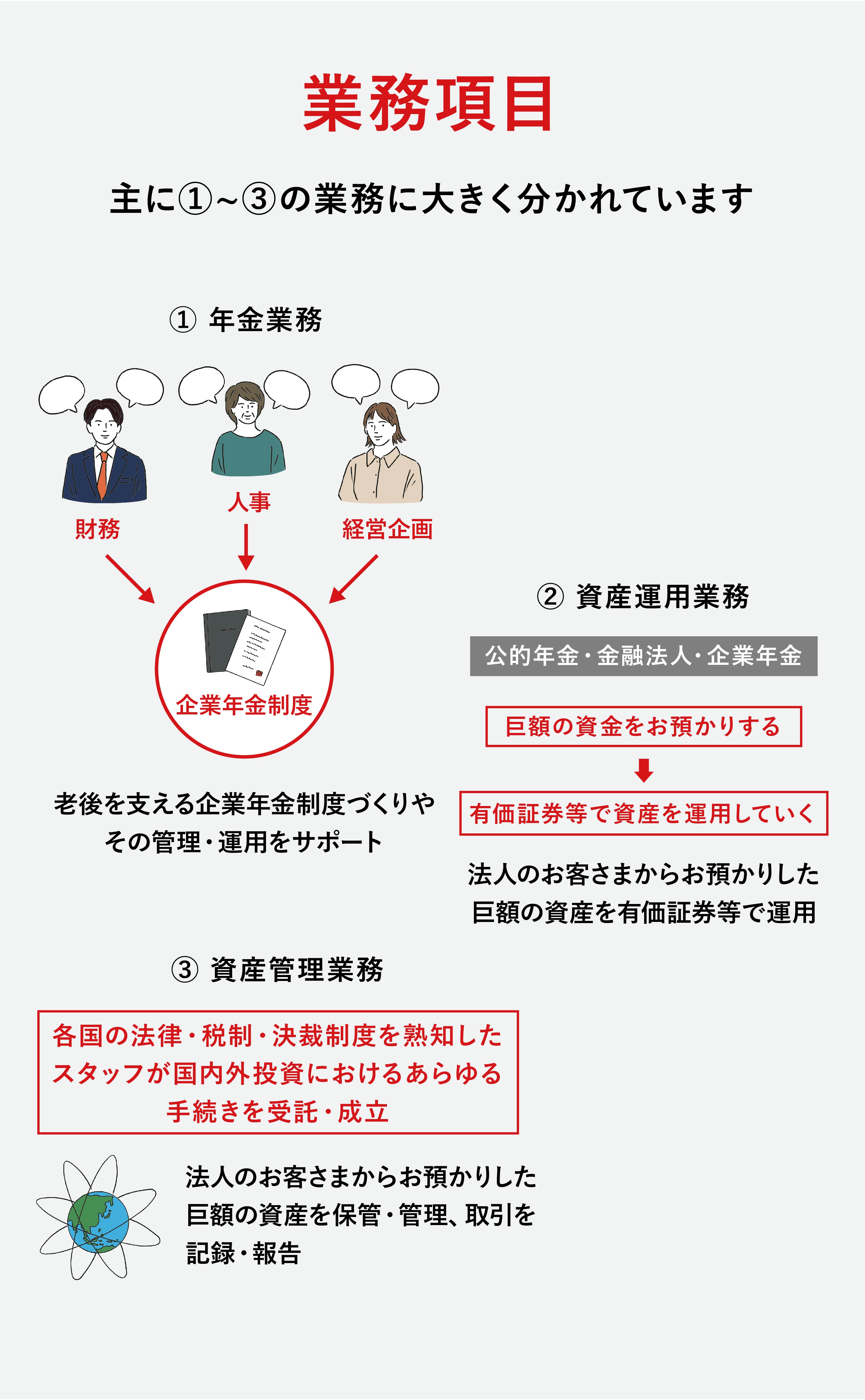「資産運用事業」は、公的年金を運営している国や企業年金制度がある企業、金融法人などのお客さまから巨額の資産をお預かりし、国内外の有価証券やオルタナティブ資産等幅広い運用を行っています。