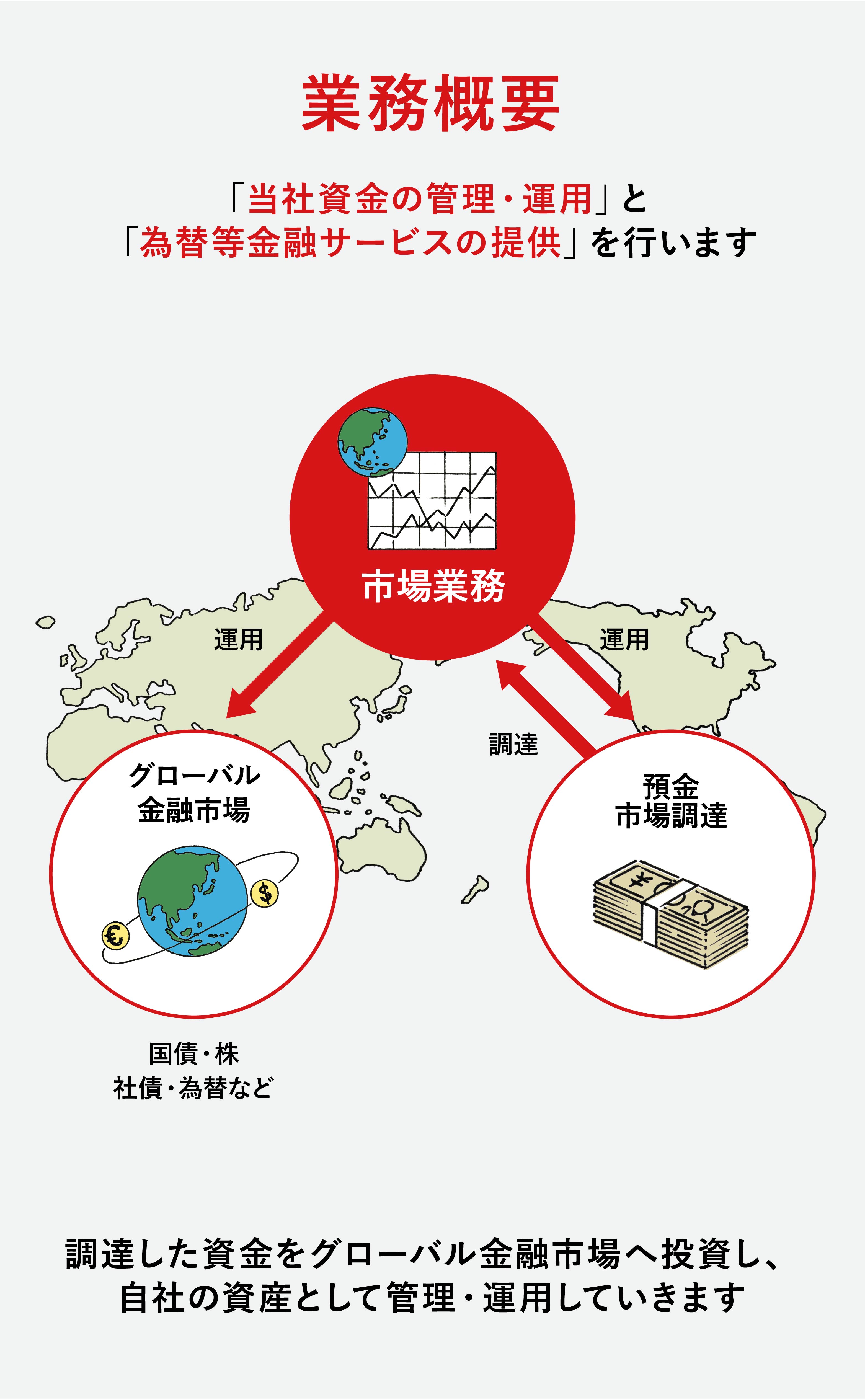 市場事業は、世界経済の中長期的なトレンドや金融マーケットの変動を的確に捉え、三菱UFJ信託銀行の資金を世界中の国債・株式・為替・社債等のあらゆる金融商品に分散投資し、安定した運用を行います。また、円・ドル・ユーロ等の資金を安定的に調達する三菱UFJ信託銀行の資金繰り業務を担い、刻々と変動する市場環境で三菱UFJ信託銀行の資金状況を最適な状態に運営し、三菱UFJ信託銀行を支える要となる役割を担っています。